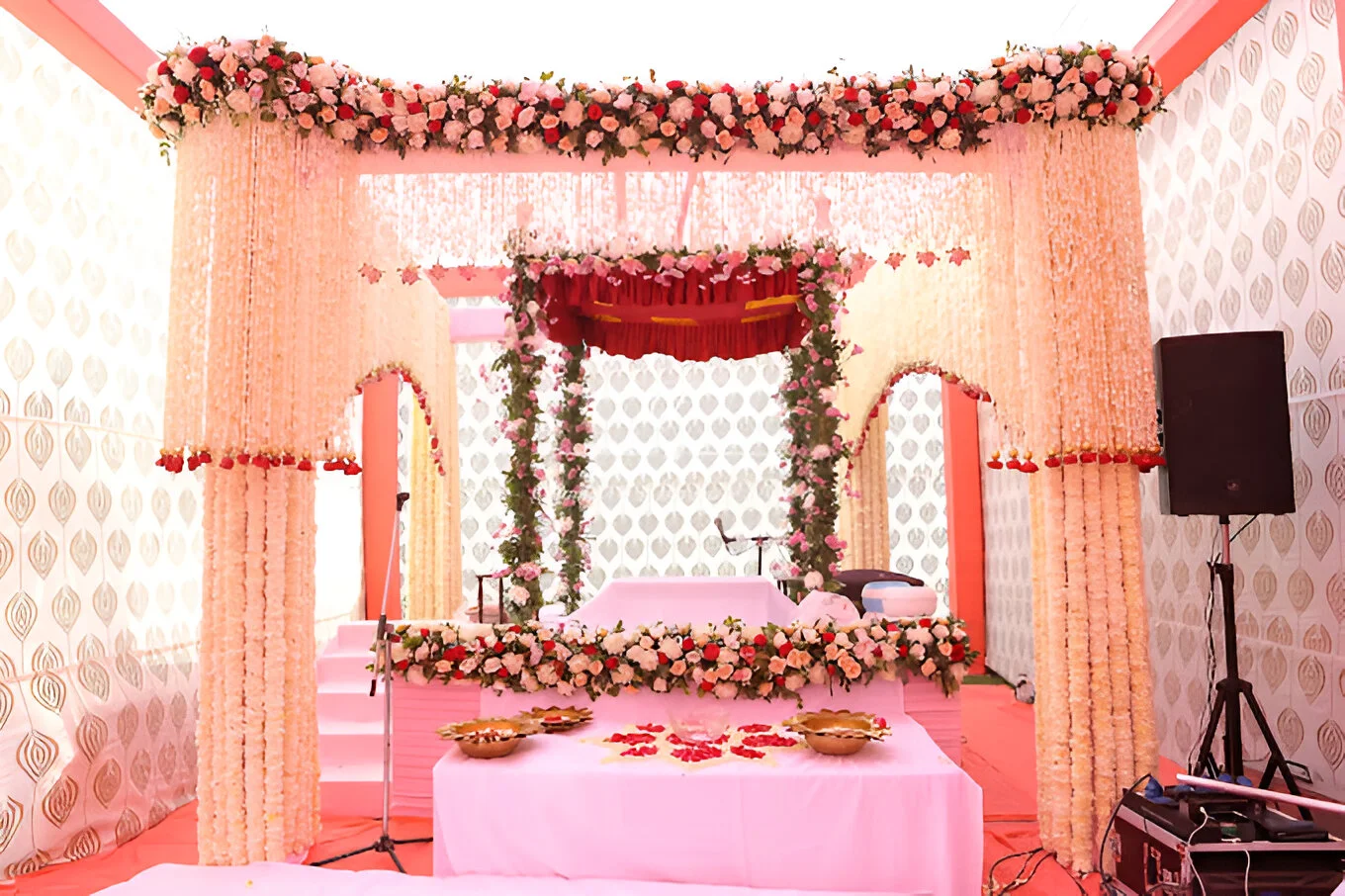Wedding decoration prices in Noida usually start around ₹30,000. This is ideal for micro weddings or small wedding events. For big weddings with full decor, costs can reach ₹6,00,000 or more. The final price depends on the venue, theme, guest count, and room count.