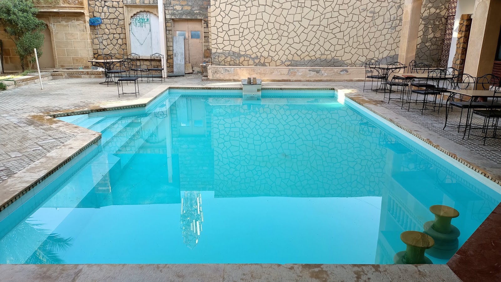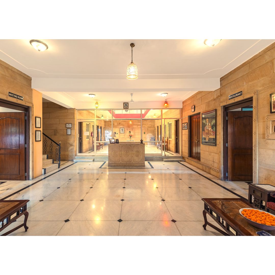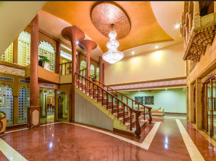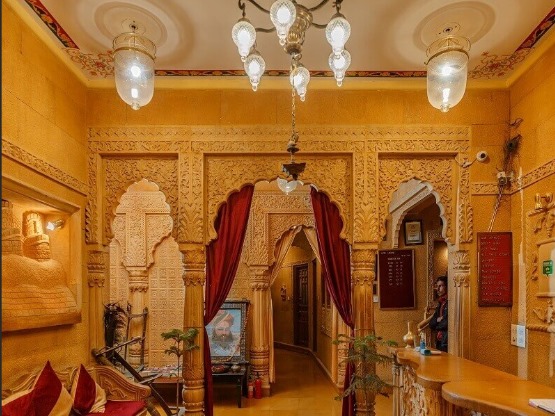 The elegant balconies and bay windows, artistically decorated apartments, bricked poolside, and hand-carved reception desk flanked by stone pillars add to the regal feel, making it an ideal wedding venue in Jaisalmer at affordable Golden Haveli costs.