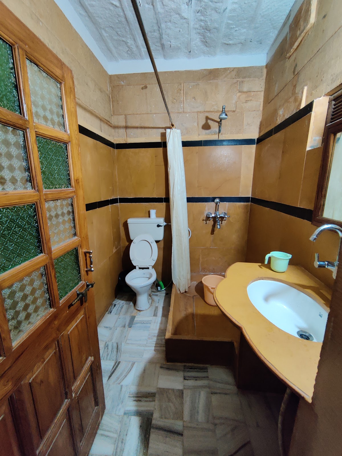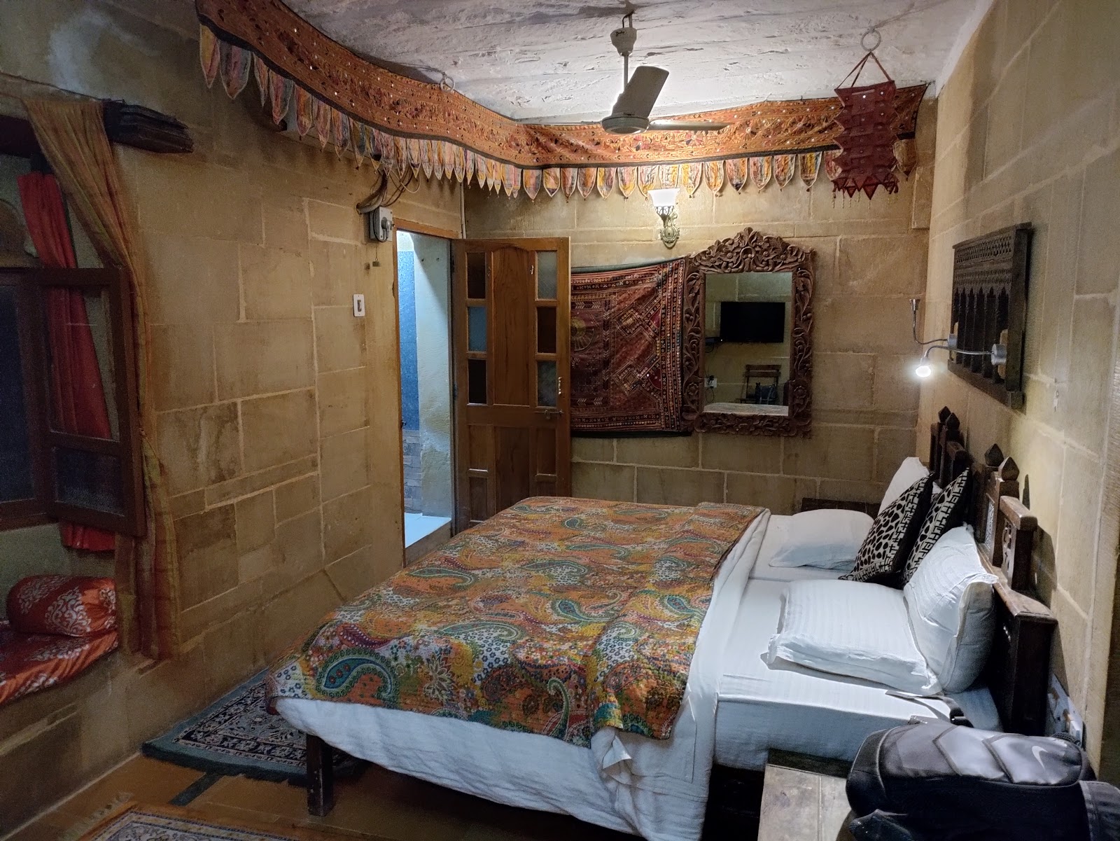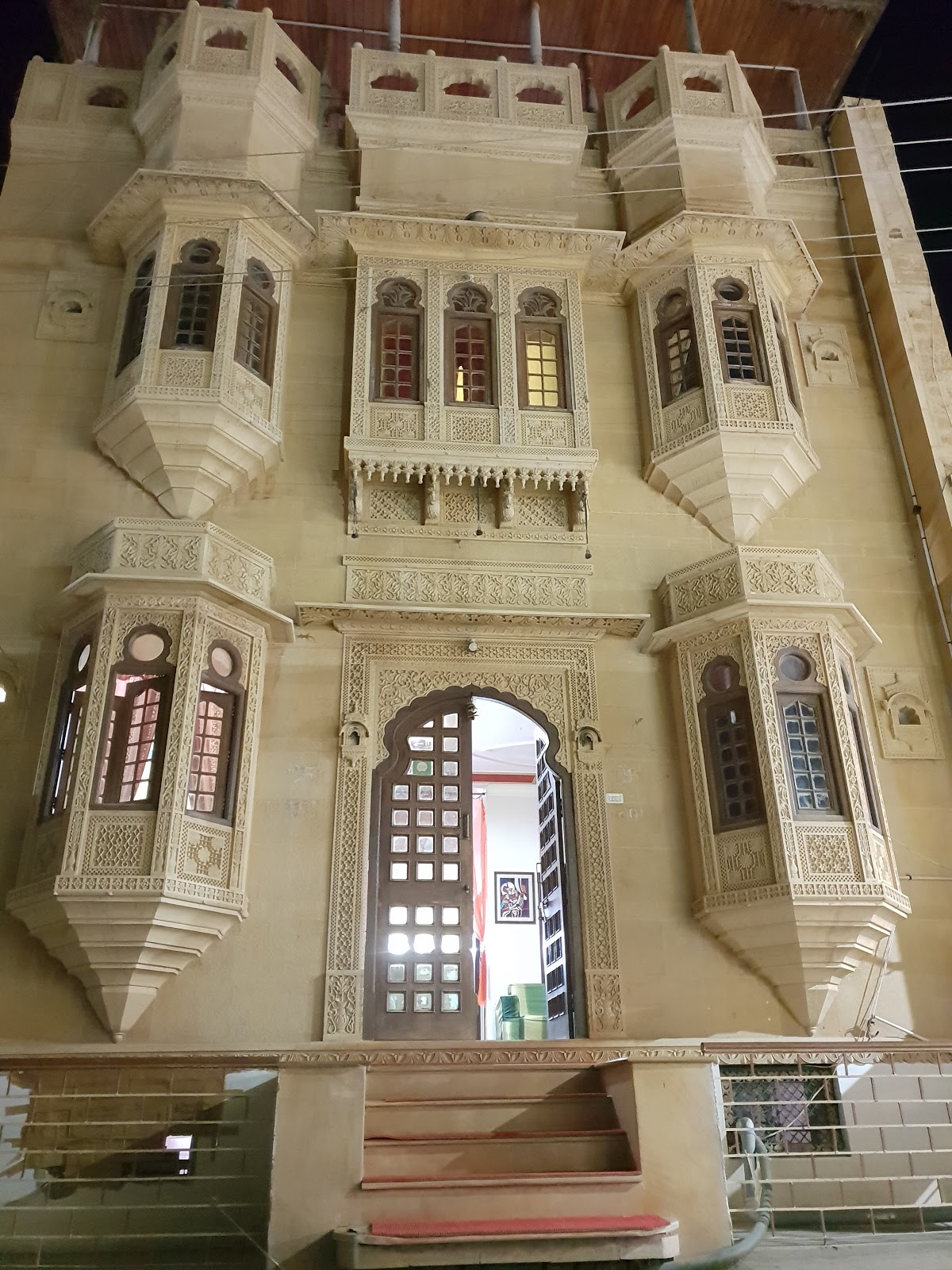 The elegant balconies and bay windows, artistically decorated apartments, bricked poolside, and hand-carved reception desk flanked by stone pillars add to the regal feel, making it an ideal wedding venue in Jaisalmer at affordable Golden Haveli costs.